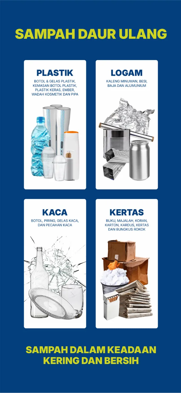 Botol plastik, gelas kaca, kaleng, dan kertas bersih.